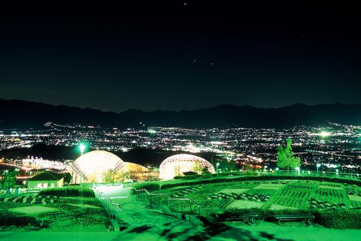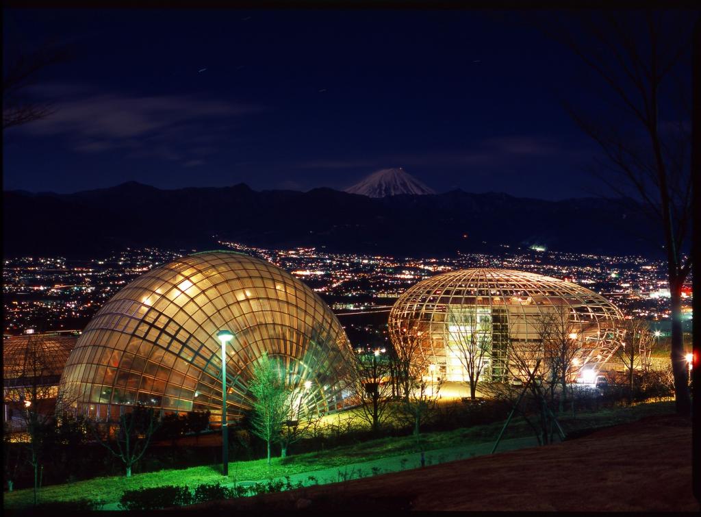 最初にご案内するのは山梨県山梨市の「笛吹川フルーツ公園」。山梨といえば富士山ですが、この公園からももちろん望むことが可能。タイトルの写真のように、夕暮れ時には世界遺産と甲府盆地の夜景の競演も楽しめてしまいます。