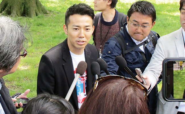 囲みの取材に応じる綾部祐二さん(撮影:池浦)