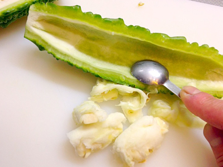 その間にゴーヤを切っていきます。流水で洗った後、両サイドを切り落とし、縦半分に切ります。中の種と白い綿をスプーンでかき出します。