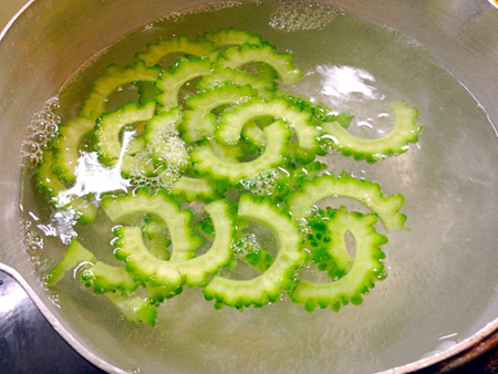 3.湯が沸騰したら、3gほどの塩を入れ、刻んだゴーヤをぶち込み強火で湯がきます。