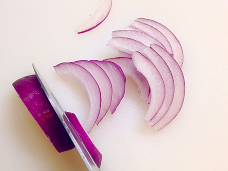 5.赤玉ねぎを太めの5mm厚にスライスします。