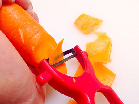 6.人参はピーラー(皮むき)で使う分だけ皮を剥いて、輪切りに切るようにピーラーでそぎ落とします。