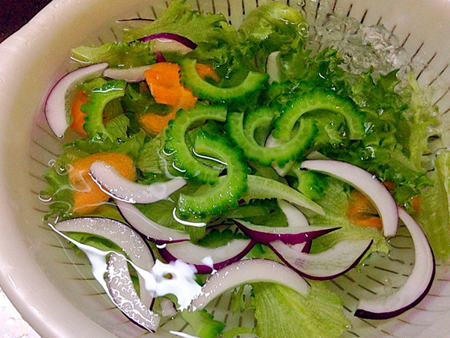 レタス、人参、赤玉ねぎ、豚肉、ゴーヤを均等に口にほうばって下さい。