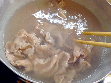 8.湯を再度沸騰させ、おろし生姜を投入し、豚肉を入れて強火で湯がきます。
