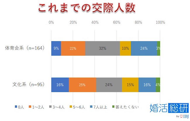 一方、体育会系出身には「7人以上」との交際経験がある方が少し多く、文化系出身には「交際経験ゼロ」の方が少しだけ多い結果となりました。つまり、「体育会系出身にはモテる人もいる」「文化系出身者にはモテない人もいる」ということは、やはり言えるかもしれません。しかし、「体育会系出身だからモテる!」「文化系出身だからモテない!」これは、 誇張表現かもしれません。
