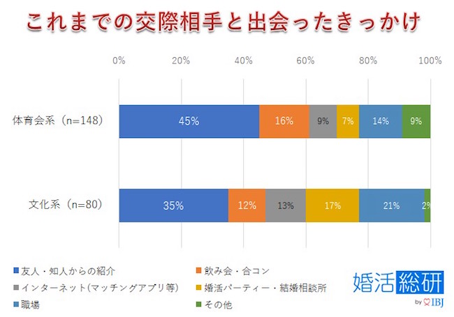 体育会系は「飲み会・合コン」と回答した人が文化系よりも4%高いですが、体育会系の人は飲み会の盛り上げ役になることも多いから、なんとなくうなずけますね。一方、 文化系出身は体育会系出身より「婚活パーティー・結婚相談所」の割合が10%高い結果となりました。婚活パーティーや相談所には、 同じように相手を探している人が来る分、飲み会や合コンに比べて出会いにつなげやすい、無駄がないと考えらいるのかもしれません。