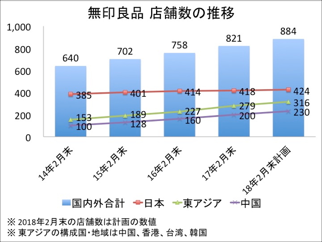 出店攻勢により東アジアの店舗網が急速に拡大しています。14年2月末時点の店舗数は153店でしたが、15年2月末では189店、16年2月末では227店、17年2月末では279店となっています。特に中国で急拡大していて、17年2月末では前年同期比40店純増の200店となっています。18年2月期には国別では最大となる30店の純増を計画しています。中国市場の重要性はより増していきそうです。