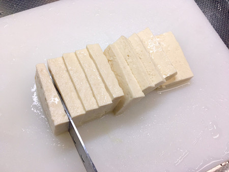 4.鶏肉は、5mm幅くらいでへぎ切りにします。