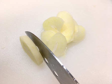 3.ニンニクは上下を少し切り落とし、皮を剥いて薄くスライスします。