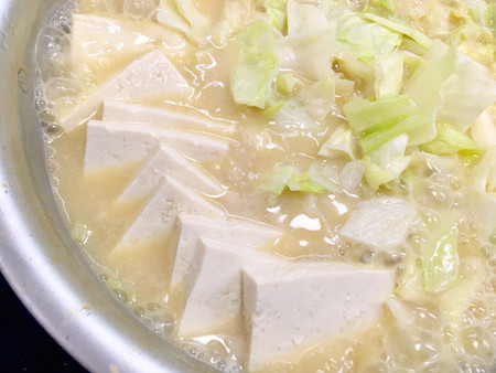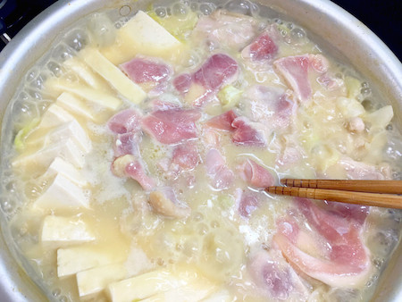 5.鍋に水を入れ強火にかけます。温まってきたら白みそを溶きます。