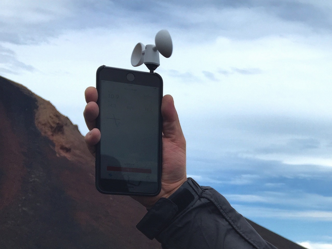 浅間大社でお参りし、飛行の安全を祈願したあと、早速ドローンの離陸の準備を始めました。幸い山頂付近は晴れていましたが、風は予想通り強く、iPhoneの風速計で計測すると平均5~7mくらいでした。小型のドローンでは間違いなく風にあおられ、最悪ロストしてしまうことも考えられます。