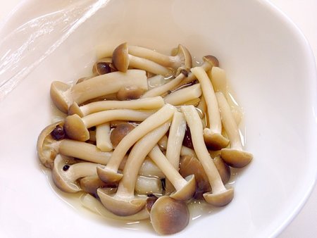 2.ばらしたしめじを器に入れ、水も30㏄ほど加えてラップをかぶせ、700Wで1分レンジ加熱します。