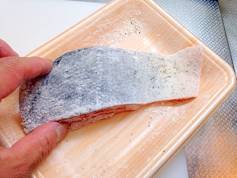 6.しゃけに小麦粉をまぶし、余分な粉ははたき落とします。