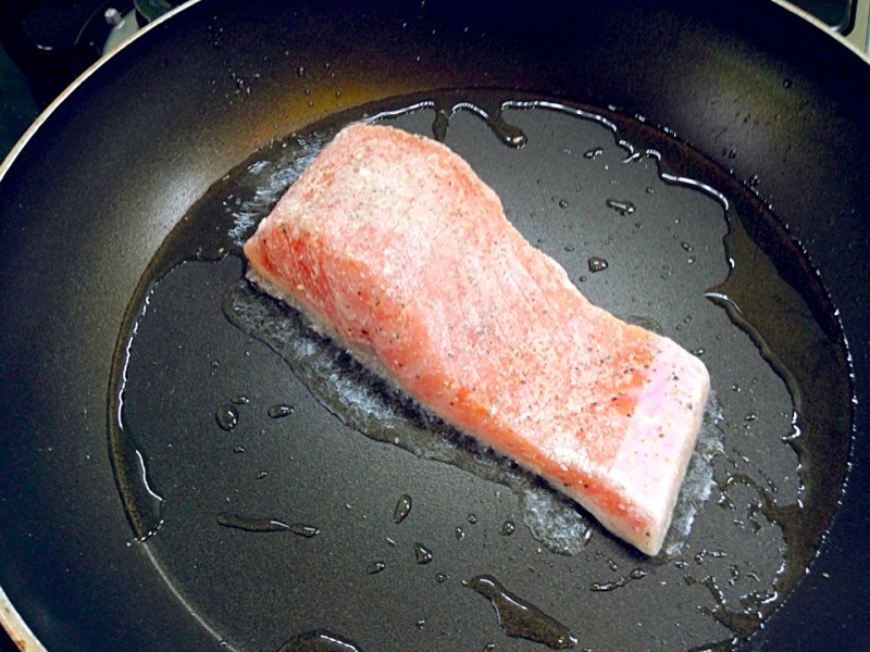 フライパンが熱くなったら「しゃけ」を皮を下にして投入、強火のまま2~3分焼きます。