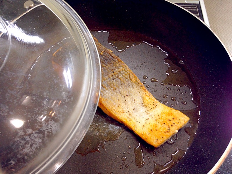 8.焼目が付いたら、裏返しフタをして5分を目安に蒸し焼きにします。
