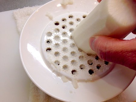 ピーラーで皮を剥いた大根をおろし器ですりおろします。