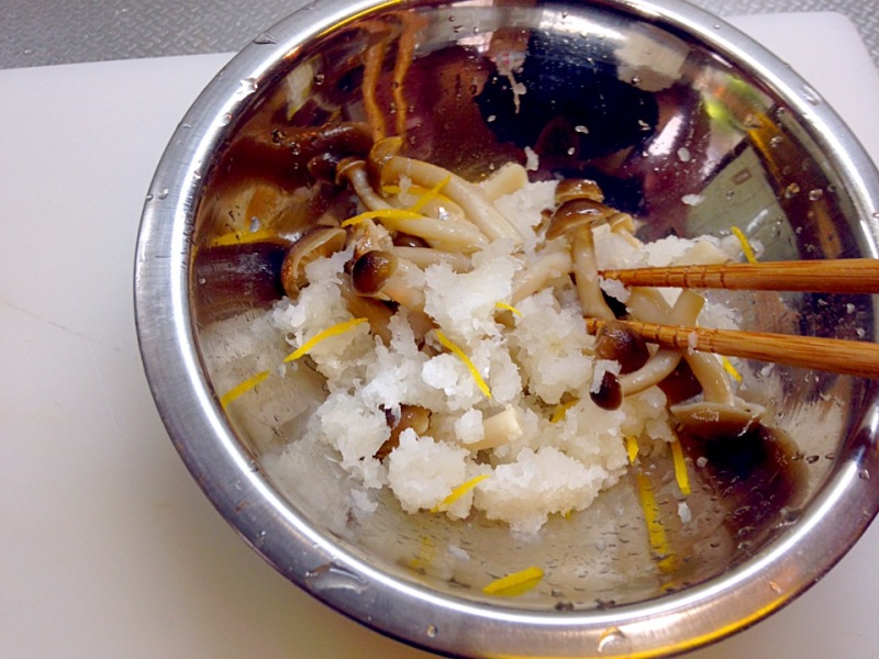 10.ボウルに大根おろし、しめじ、刻み柚子を入れ混ぜておきます。