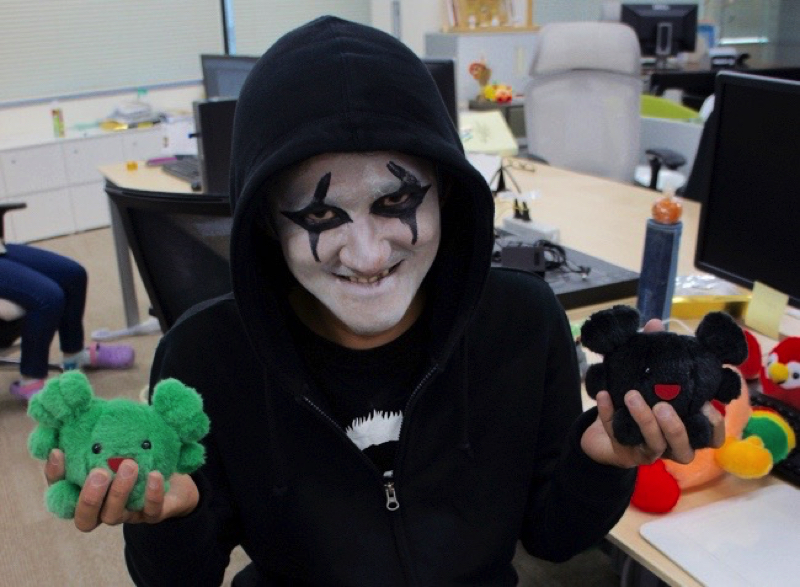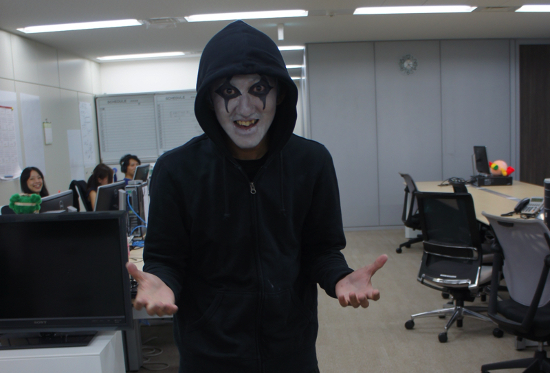その声が社内に響きわたると、迷子になった悪魔のことなどすっかり忘れかけていた編集部一同は、一斉に声のする方へ目を向けた。しかしそこに悪魔はいない。全身ずぶ濡れでトレードマークの顔メイクがすっかり落ちたという大魔王は、これから着替えとメイクの調整をおこなうのでトイレへ駆け込んだとのこと。なにもかもが悪魔らしくない…。拍子抜けした編集部一同が、元の仕事に戻ってから20分あまり。ついに、黒い目張りに白塗りの大魔王・ポルポルは、正面玄関から姿を現した。