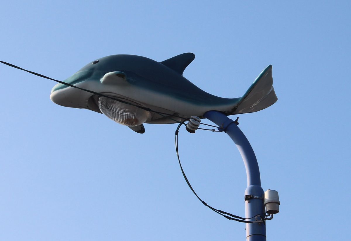 県の南西部に位置し、周囲を東シナ海・有明海・八代海に囲まれた天草市。沖合には200~300頭ほどのミナミハンドウイルカが定住しており、それが街のひとつの売りにもなっていると聞きます。街灯のカバーもイルカ仕様という徹底ぶりです。