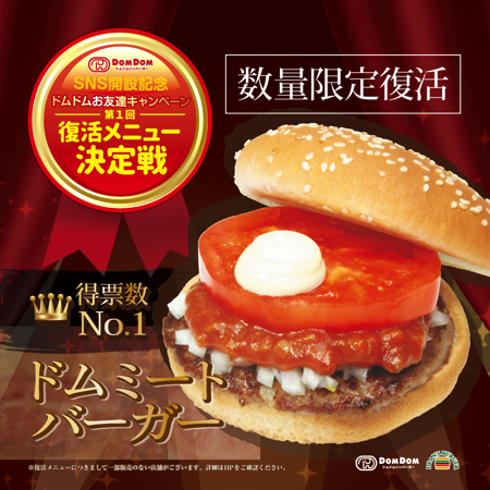 SNS開設記念として開催された「第一回復活メニュー決定戦」では、エントリーされた9商品の中から2014年に販売されていた「ドムミートバーガー」が1位に選出された