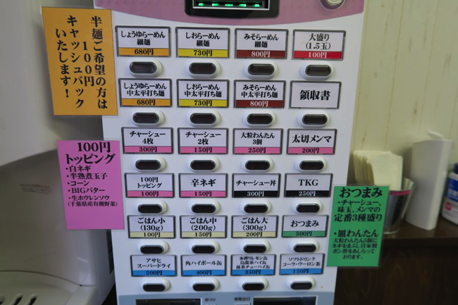 「醤油」「塩」「味噌」の3種類のラーメンを作り分けるが、券売機筆頭メニューは「しょうゆらーめん」。