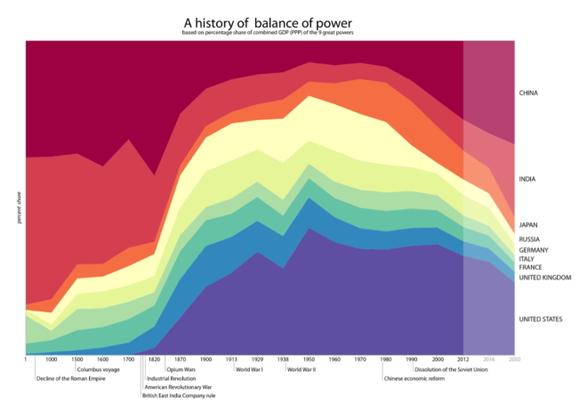 A History of Balance of Power Sources – GDP data for years 1-2000: Angus Maddison, University of Groningen; 2016 IMF Projected GDP Growth; 2050 PricewaterhouseCoopers Projected GDP Growth