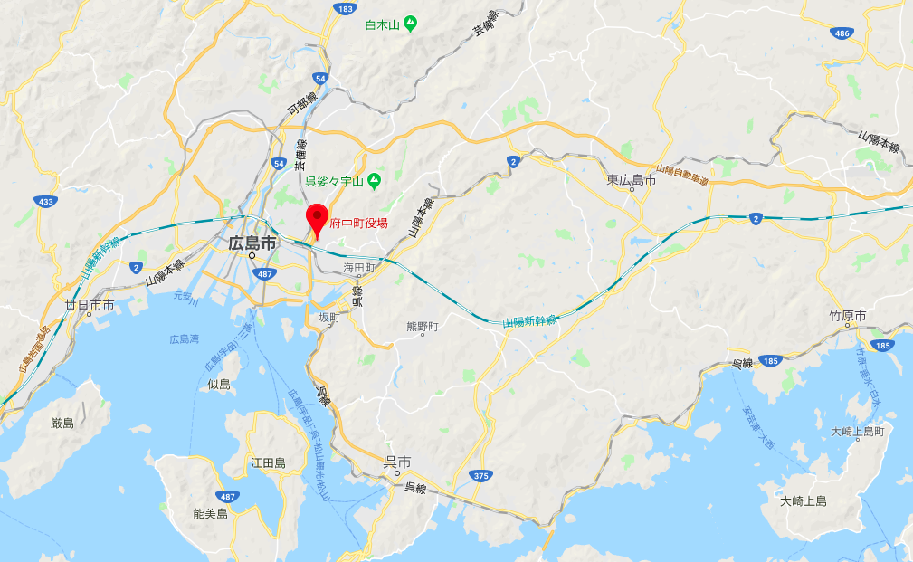 Googleマップより、府中町の位置(目印の場所は府中町役場)