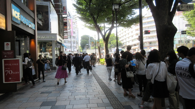店舗の位置は表参道に面し、明治通りとキディランドの中間あたり。熱中症対策も兼ねて、けやき並木の影なる歩道の端に行列を並ばせている。店舗は2層になっていて、立ち食いでいい人は1階で、ほぼ並ぶことなくかき氷が食べられる。立ち食いは丼鉢ではなく紙カップで提供され、値段も1割ほど安くなる。座る席もないのに大行列となっている、「ロールアイスクリームファクトリー」とは、事情が異なっている。
