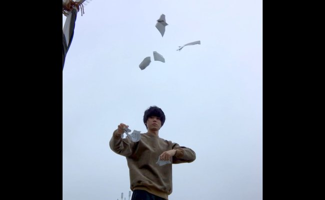 屋上での撮影では、小松さんが菅田さんに手渡した原稿が風で舞ってしまうハプニングも起こりましたが、菅田さんがすかさず俊敏にキャッチ。思わず笑ってしまう、お二人の自然な笑顔がとても素敵で、その様子はそのまま本編に使用されました。