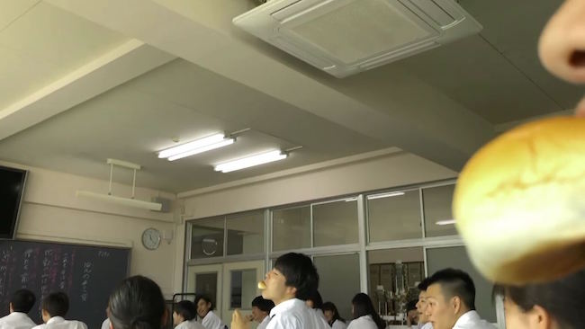 放物線を描いて口元に届くあんぱんを食べる生徒達。