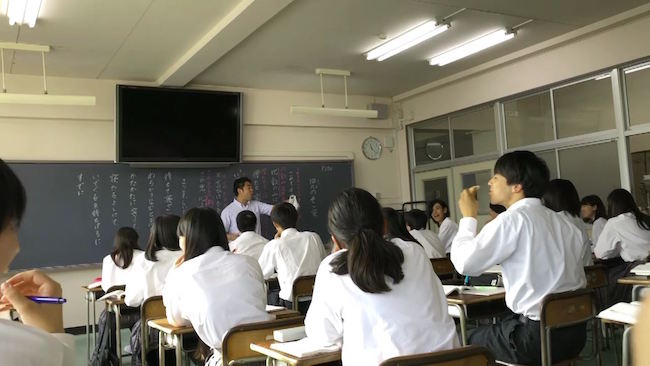 先生が教室で英語を教える、ごく普通の授業の様子が映し出されます。