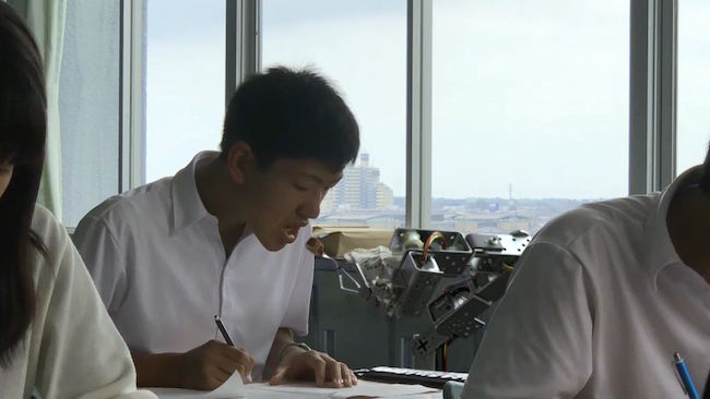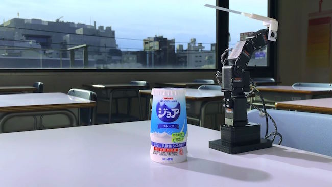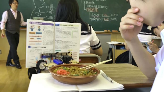 先生が黒板を見た瞬間に、現れたアームの先に付いたおかずを食べる生徒。し、自然すぎる。