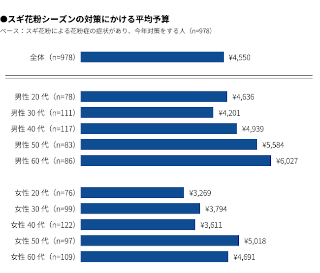 最後に、今年のスギ花粉シーズンの花粉症対策にかける予算について確認します。合計予算は平均4,550円で、ボリュームゾーンは「1,000円以上~3,000円未満(47%)」でした。性年代別に比較すると、全年代において女性よりも男性の方が予算額が高いことがわかりました。