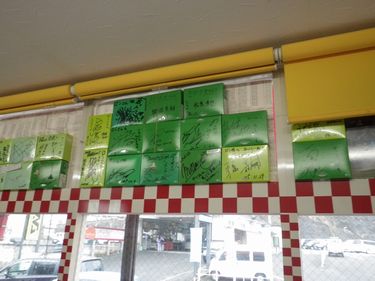 アメリカンテイスト溢れる店内には、テイクアウト用の箱に書かれた芸能人のサインがこれ見よがしに飾られています。