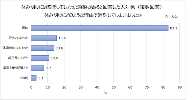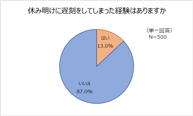 休み明け、遅刻経験者 13.0%!理由の1位は「寝坊(83.1%)」