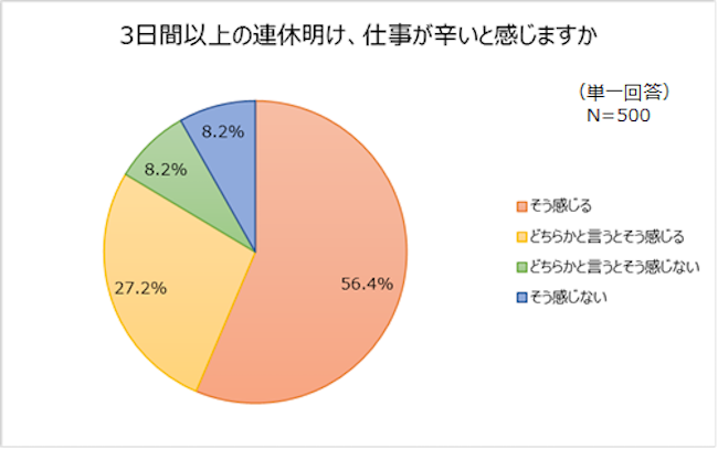 「3日間以上の連休明け、仕事が辛いと思うか」に対して、「そう感じる」「どちらかと言うとそう感じる」を合わせると、83.6%の人が辛いと感じていることが明らかになりました。オフィスを見渡してみてください。あなたの周囲のスタッフの10人中8人が「辛い」と思っているわけです。あの人も、その人も!そう思うとちょっとホッとしませんか。