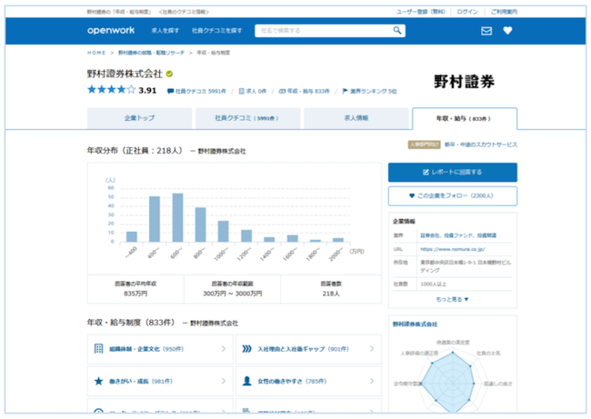 「年収グラフ」は、OpenWork の各企業ページにある年収・給与タブに掲載されています。 「年収グラフ」により、企業毎に社員クチコミ回答者の平均年収、年収分布を一目で確認できるようになり ました。