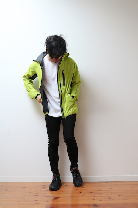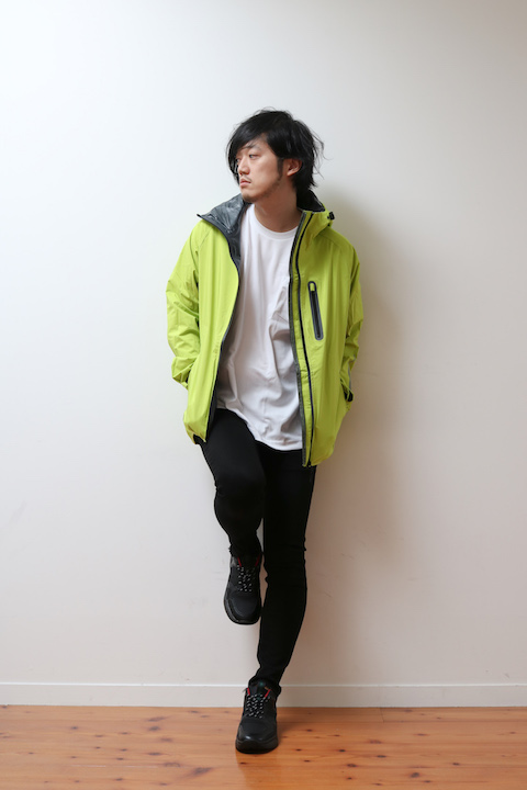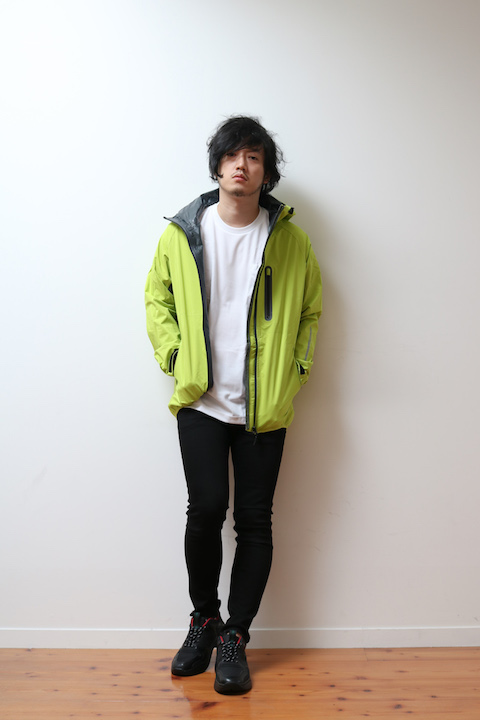 さてコーディネートですがここではあえてシンプルにまとめました。ネオンカラーのマウンテンパーカーはカジュアルな印象なのでなるべくドレスライクに合わせます。モノトーンと細身の黒スキニーでまとめました。足元は革靴でも良いのですがインナーにツヤ感のあるカットソーを使ったので、あまりキメすぎにせずスニーカーにしました。スニーカーはパンツと同色にすることであまり目立たせずにカジュアル感を抑えるようにしています。