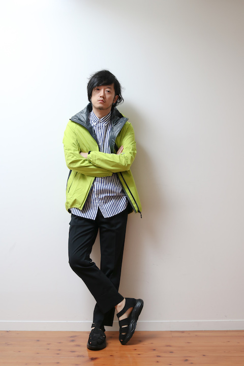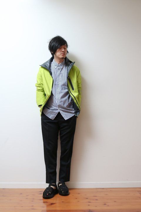 こちらは先ほどの着こなしよりも少し大人な印象にまとめたもの。先ほどはTシャツとデニムでしたがこちらはシャツとスラックス。その分少しだけドレス感は上がってますが、バランスはもちろん調整しています。