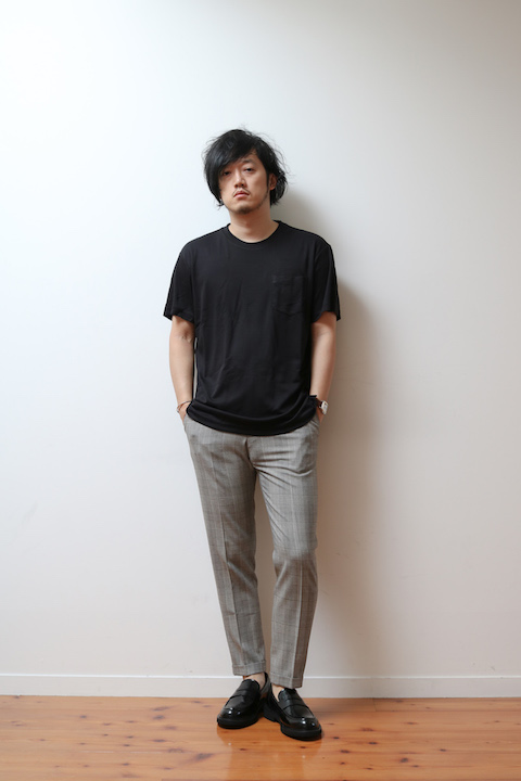 ツヤのあるカットソーに細身のスラックスを合わせ足元はローファーを持ってきたスタイル。ローファーは今月のメルマガでも紹介しましたがZARAのもの。ボリューム感がありフォーマルだけどキメすぎにならない面白いアイテムです。