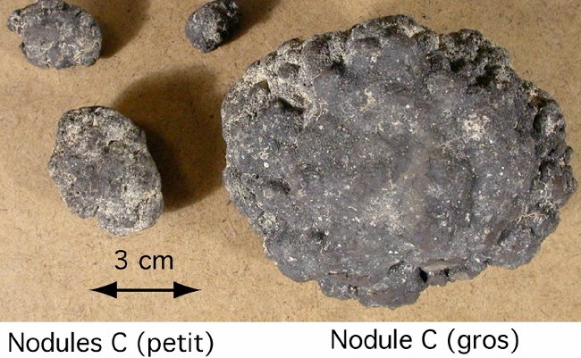 大きさは直径3センチから10センチ、ジャガイモぐらいの大きさです。海水中のミネラルが何か(貝殻の破片など)に付着する形で作られると考えられていますが、成長のスピードは非常に遅く、1センチ成長するのに100万年かかるとされています。