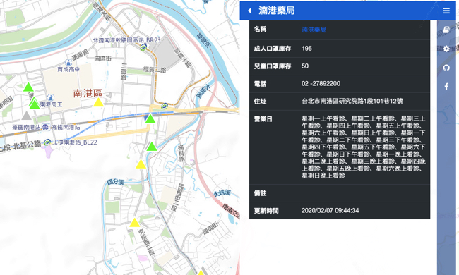 実際のマップを見ると、台湾中の薬局情報がマップ上に表示され、三角形のアイコンをクリックすると、現時点での成人用マスクと子ども用マスクの在庫数が表示される。