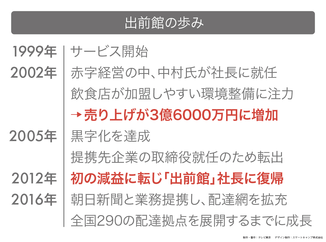 出前館を軌道に乗せた中村は提携先企業「カルチュア・コンビニエンス・クラブ」の取締役となり、出前館から離れる。すると、増収増益を続けていた出前館の業績が伸び悩み、2012年には初の減益に転じる。危機感を抱いた中村は社長に復帰。出前館の立て直しを図る。