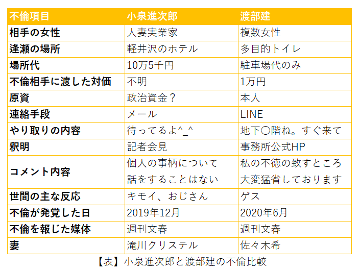 そこで、小泉環境相と渡部を不倫という観点から、さまざまな点で比較してみる。すでに報道されている内容をもとに作成してみた。