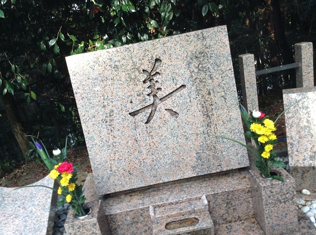 ▲大きく「美」と彫られた山村美紗の墓。花房さんはこの墓の前で夫の巍氏と出会った