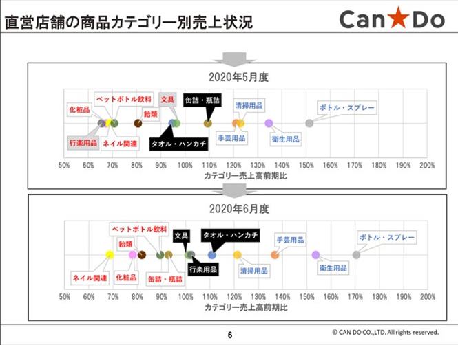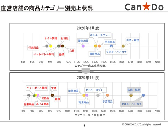 キャンドゥの決算説明会資料において、直営店舗の商品カテゴリー別売上高が月毎に公開されています。消費者の心理状況が映し出されており、興味深い内容となっています。
