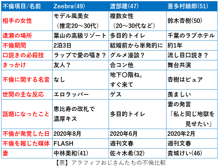 こう比較してみると、同じアラフィフ不倫でもさまざまな違いがあることがわかる。逢瀬の場所が渡部「多目的トイレ」、喜多村「千葉のラブホテル」、Zeebra「葉山の高級リゾート」とランクに差があるのは、相手に対する情熱とフトコロ事情の違いからだろうか?