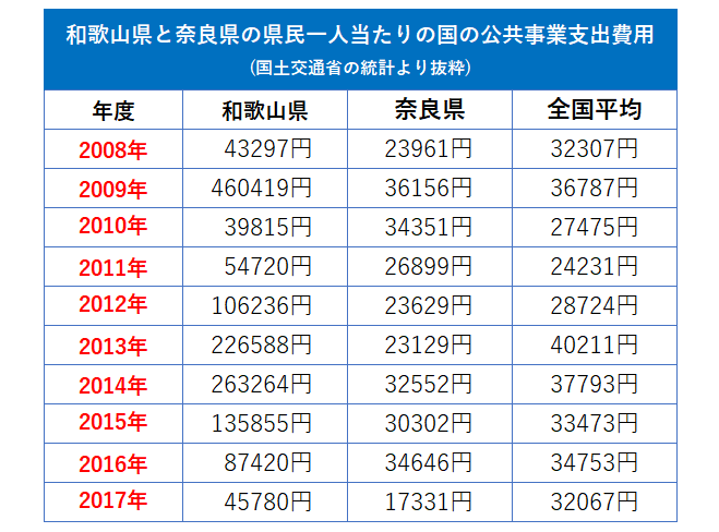 下の表は、和歌山県と奈良県に支出された「国の公共事業費」です