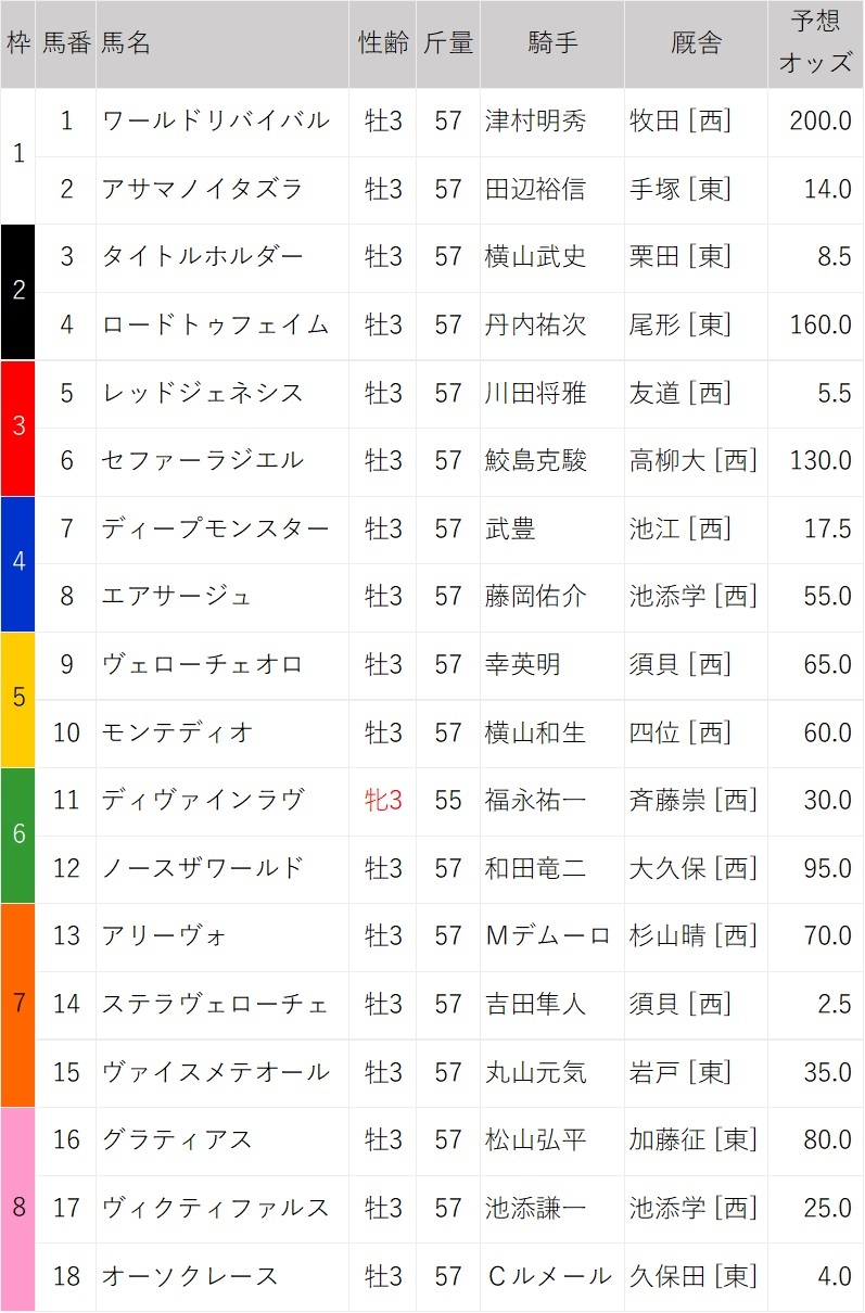 ほか、皐月賞と東京優駿(日本ダービー)で3着と好走してきた(14)ステラヴェローチェも上位人気と目されて当然の存在。好相性を示す神戸新聞杯で3着の(10)モンテディオ、G3共同通信杯ではのちのG1馬2頭の間に割って入った実績が光る(17)ヴィクティファルスも侮れない。