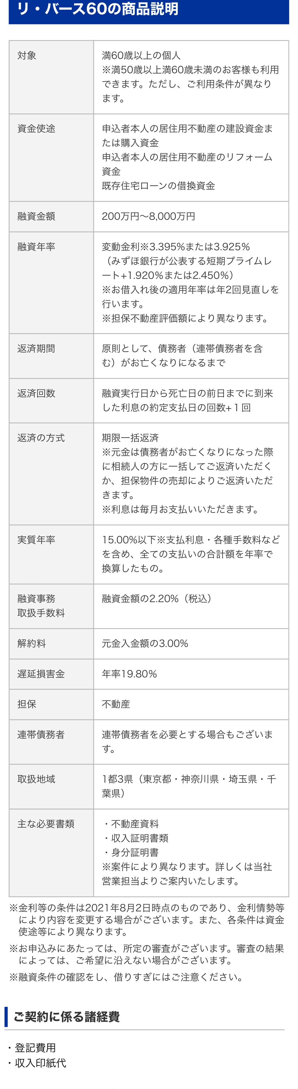 そこでおすすめしたいのが、SBIエステートファイナンスの「リ・バース60」。一言でいえば、「満60歳以上の方向けの住宅ローン」です。